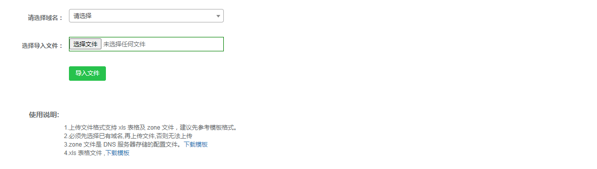 - 导入记录:添加域名完成后,点击批量操作,进入批量操作页面,选择批量导入,将准备好的解析数据,导入到云解析DNS